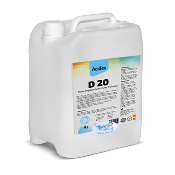 Acidex D20, hastane, otel, okul ve gıda üretim tesislerinde hijyenik yüzey temizliği sağlayan, biyolojik olarak çözünebilen konsantre temizleyicidir.