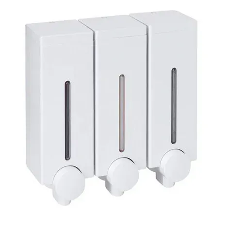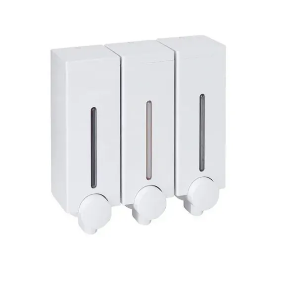 Otel, ev ve iş yerleri için ideal, 3 bölmeli, kilitli beyaz şampuanlık. Sıvı sabun, şampuan ve losyonları hijyenik, kontrollü ve ekonomik kullanın.
