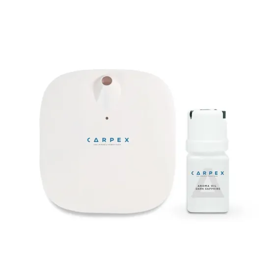 Carpex Micro Aroma Difüzer, küçük ve orta büyüklükteki mekanlar için tasarlanmış kompakt ve şık bir koku makinesidir.