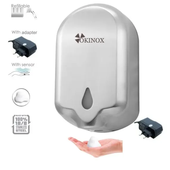 Okinox elektrikli köpük sabun dispenseri, 1100 ml köpük sabunluk, pilli ve doldurulabilir sabun dispenseri, paslanmaz köpük sabun cihazı, antibakteriyel köpük sabunluk, duvara monte sabun dispenseri, Hijyen Market Okinox, ofis ve otel el sabunu, fotoselli olmayan köpük sabun dispenseri, uzun ömürlü sabun dispenseri.