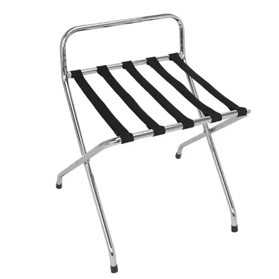 Okinox sırtlıklı, krom kaplı otel tipi valiz sehpası; sağlam plastik kemerleriyle şık, dayanıklı ve hijyenik bir bavul düzenleme çözümüdür.