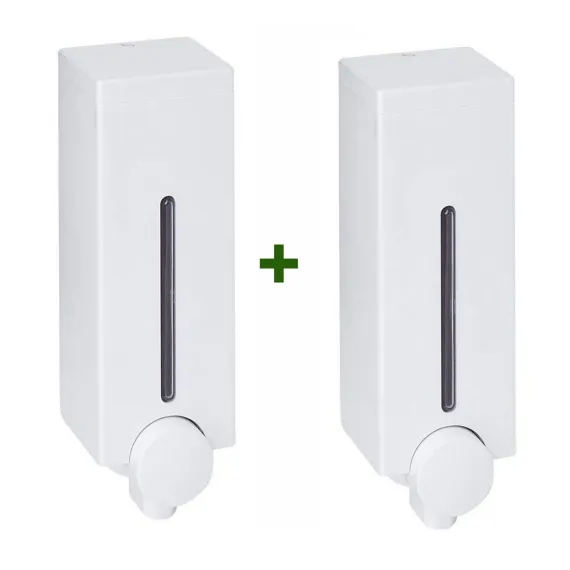 Otel tipi şampuanlık ve sıvı sabunluk seti. 450 ml hacimli, beyaz plastik tasarımıyla sabun, şampuan ve losyon için ekonomik kullanım sağlar.