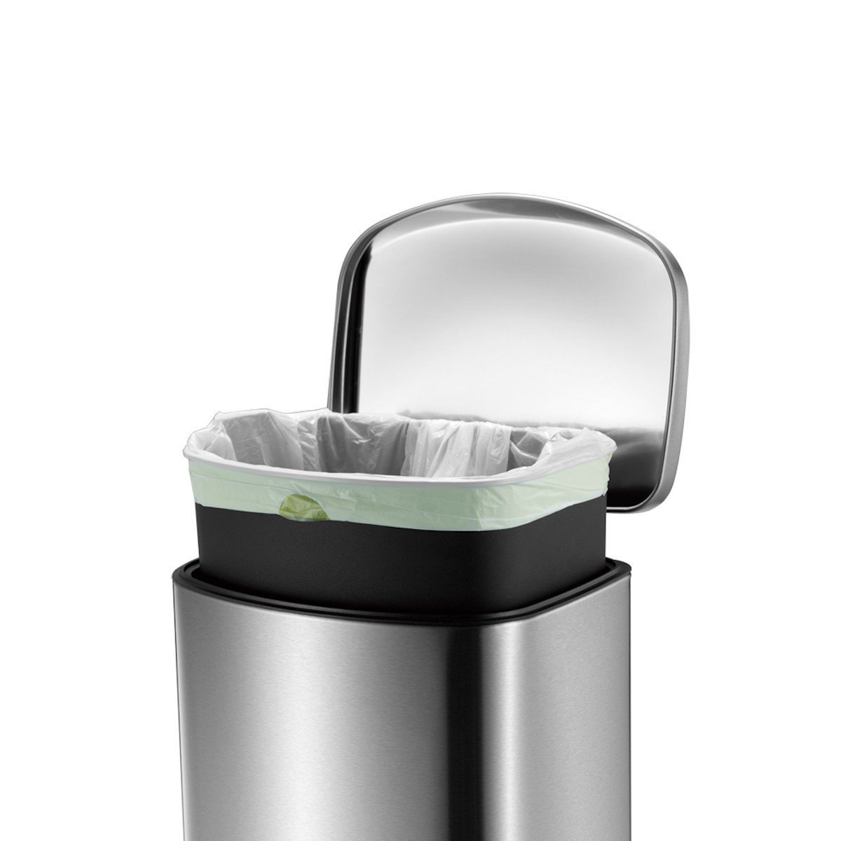 Yavaş kapanma mekanizması sayesinde kapak çarpmadan sessizce kapanır. Kilitli kapak sistemi, çöp torbası değişimi sırasında kapağı açık konumda sabitler.