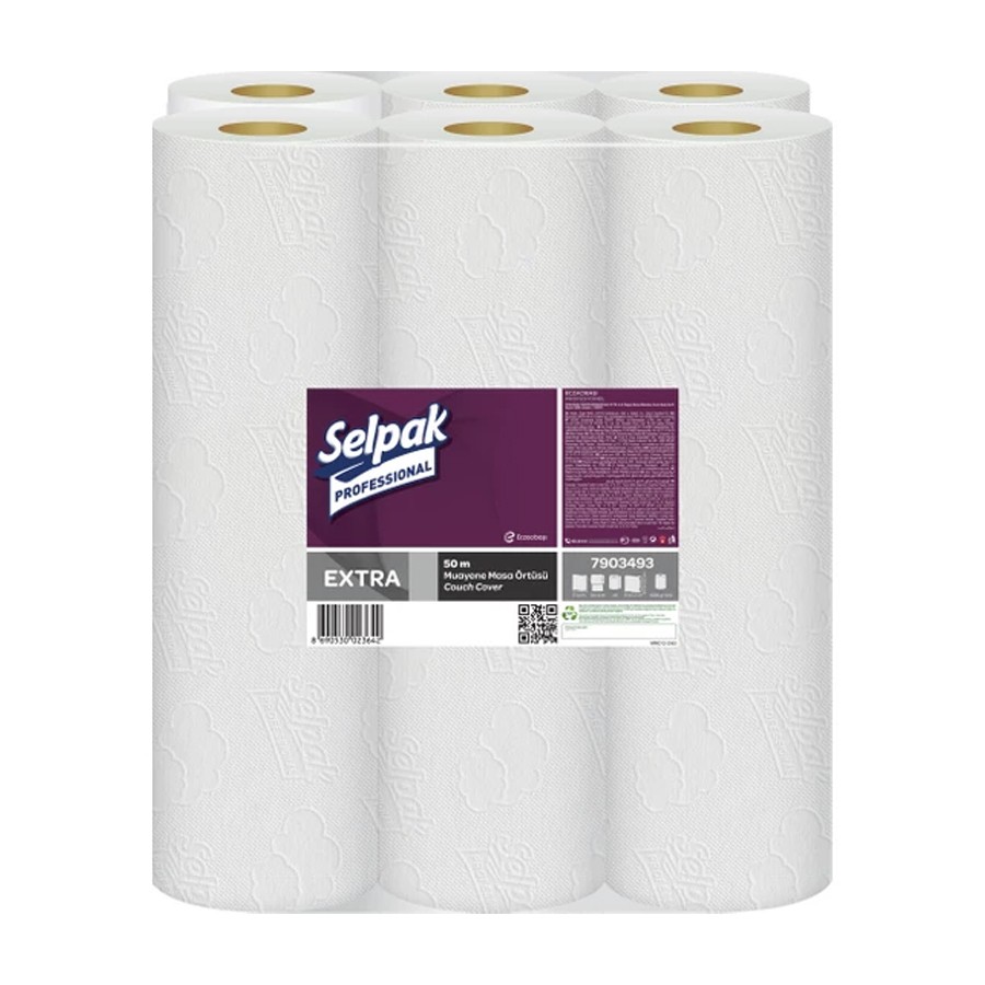 Selpak Muayene Masa Örtüsü, yenilenen gofraj dokusu ve 50 m rulo uzunluğuyla hijyenik, dayanıklı ve ekonomik kullanım sunar.