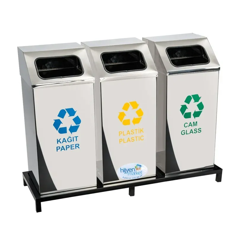 Okinox kare paslanmaz çelik geri dönüşüm çöp kovası, Sıfır Atık Yönetmeliği’ne uygun olarak tasarlanmıştır. Hem işletmelerde hem de kamu alanlarında atık ayrıştırmayı kolaylaştırarak çevre bilincini artırır. Dayanıklı 430 kalite paslanmaz çelik gövdesi, uzun ömürlü kullanım sağlar ve hijyen standartlarını korur.