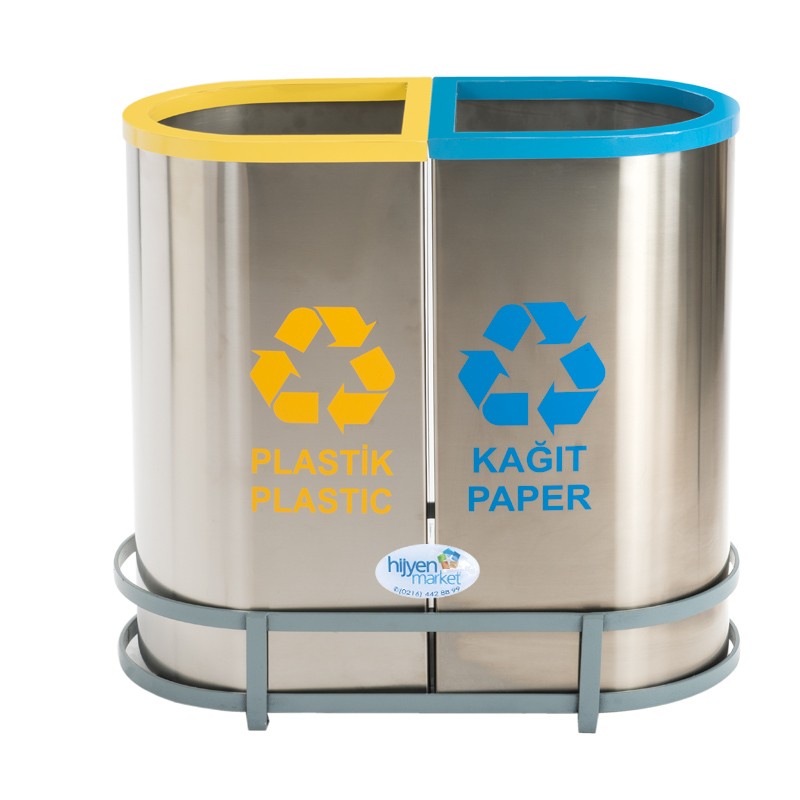 Okinox Geri Dönüşüm Kutusu; 304 kalite paslanmaz çelikten üretilmiş, renkli kapaklı ve "Sıfır Atık Yönetmeliği"ne uygun D model geri dönüşüm çöp kovası ile atıklarınızı kolayca ayrıştırın. 64x33 cm stand genişliği ve 30x30x60 cm kova boyutları ile ofis, ev veya iş yeriniz için ideal çözüm.