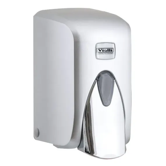 Hijyen Market Vialli sıvı sabunluk, 500 mL hacmi, duvara monte ve kilitli kapağıyla güvenli ve hijyenik kullanım sağlar.